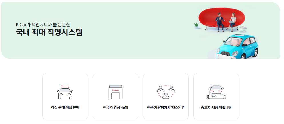 매입과 진단, 차량 관리, 판매를 K 카에서 직접 하기 때문에 차량 구매 시 딜러와의 계약이 아닌 K카와 직접 하는 계약하는 방식입니다.