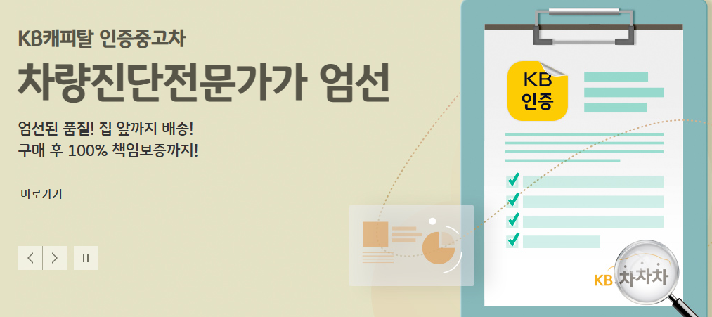 KB차차차는 국민은행 KB 캐피탈에서 운영하는 중고차 매매 사이트입니다. "중고차 고르기 진짜 단순해"를 내세운 사이트로 다음과 같은 장점을 가지고 있습니다.
