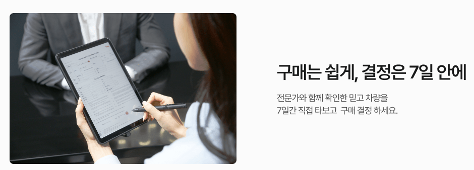 계약 시 요청한 지정 날짜에 차량을 인도받고 먼저 7일간 시승을 합니다. 7일 동안 시승 시 상담했던 내용과 다른 점이 발견되면 7일 이내에 구매 금액의 100%를 환불 받을 수 있습니다.